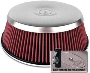 Concept II Round Air Filter Assemblies feature a beautiful lightweight aluminum lid. The lid is also perfect for user customization. The curved top enhances air flow and provides additional clearance for the carburetor float bowl vents. Ideal for applications with minimal hood clearance. Along with the redesigned lid, the Concept II air filter asseblies feature a new base that enhances air flow. Concept II air filter asseblies are available with 3 inch, 4 inch, and 5 inch elements and feature SYNTHAMAX, a 100% synthetic, non-oiled, color fast, classic red media. Billet tool and key fob included! "Conceptually" the perfect finishing touch to your custom ride!