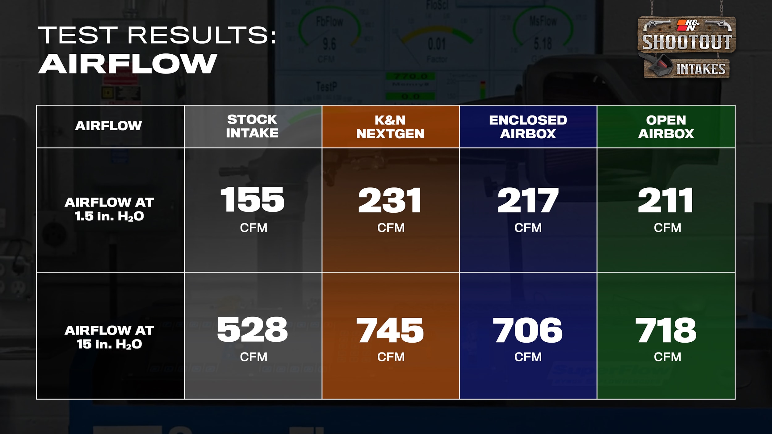 With any true test, there must be a winner. When comparing the numbers, the K&N NextGen intake showed the highest CFM numbers at the 1.5” and 15” levels. Since this is only a first comparison, the next step is heading over to the dyno for some power numbers.
