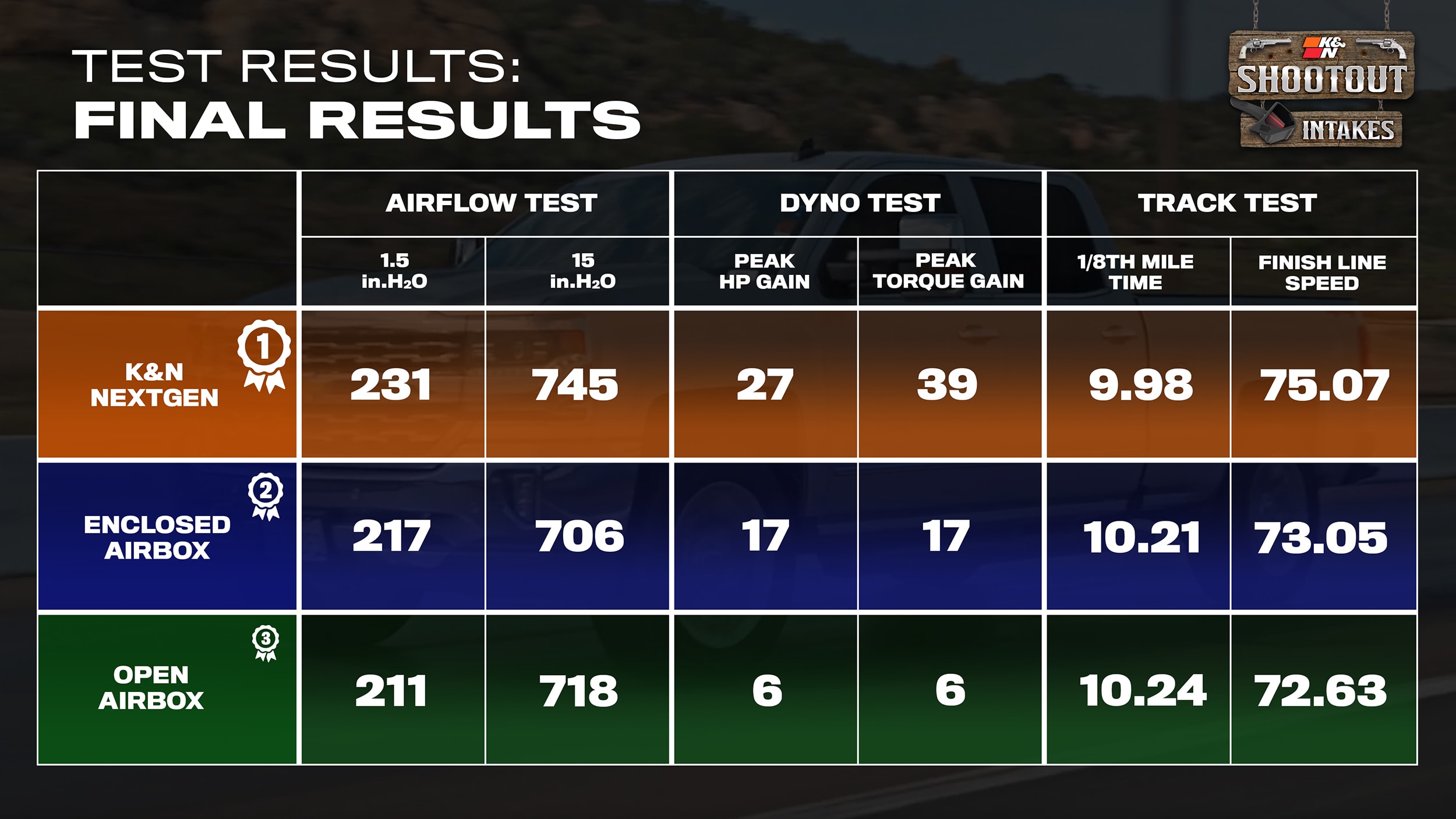 As we said initially, there are a lot of options out there and most people don’t have the ability to do this type of test comparison so we wanted to do the research and testing ourselves and the results are clear. K&N proved to be the superior intake across the board in airflow, horsepower, torque, and real world acceleration. So if you’re ready to step up to the intake shootout champ, find the intake available for your vehicle at knfilters.com and take pride in knowing that your engine is enjoying the world’s best intakes every time you hear it roar!