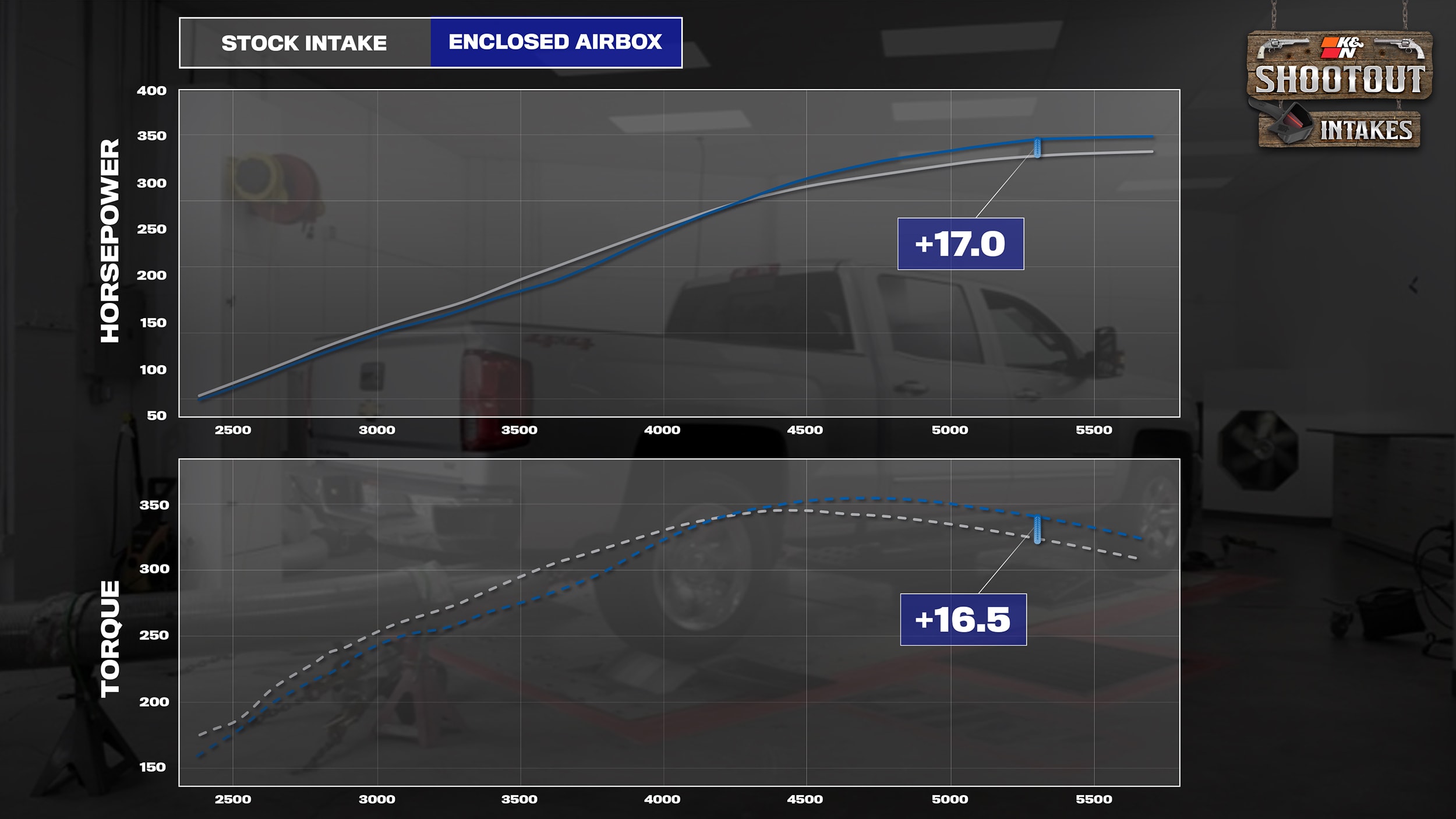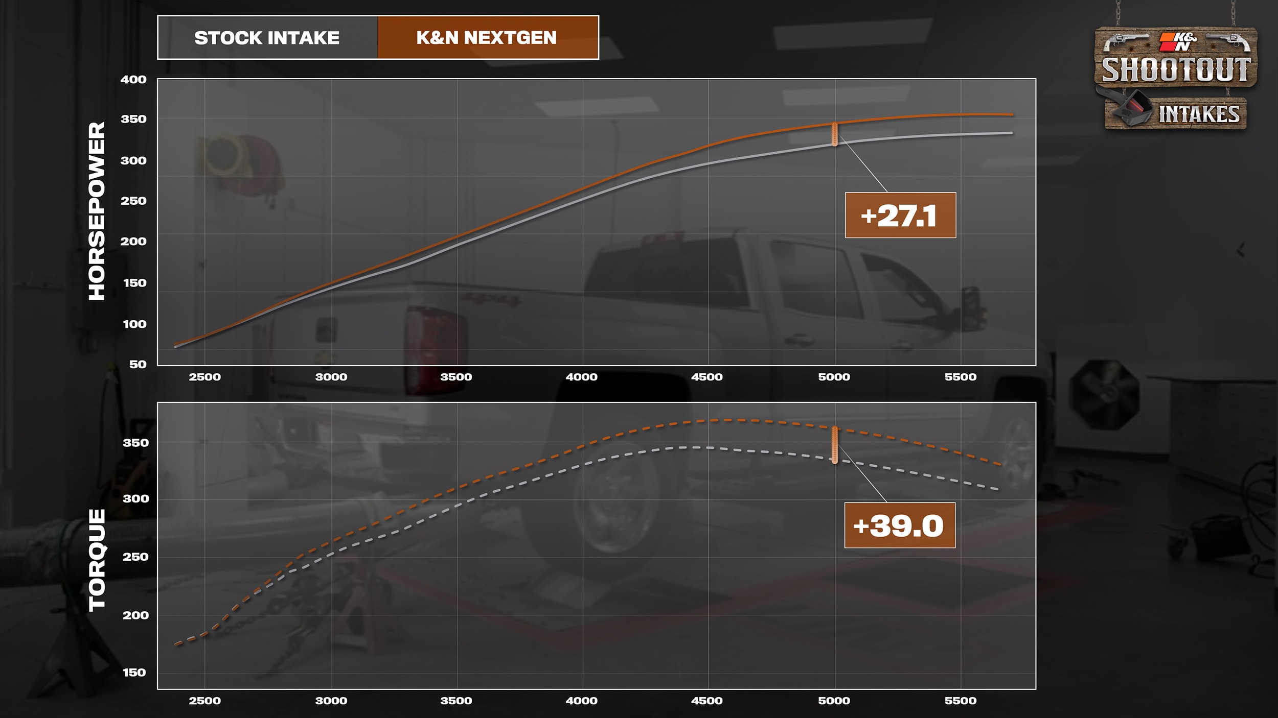 After our baseline is established, the K&N NextGen intake is installed into the truck, and the tech team checks all the numbers to make sure critical temperatures are all similar to the stock test conditions. Once that’s complete, it’s time for three more dyno pulls. After the same process of removing the top and bottom result, a clean comparison graph is created for horsepower and torque showing a max gain of 27.1 horsepower and 39.0-foot pounds of torque at 5,000 RPM.