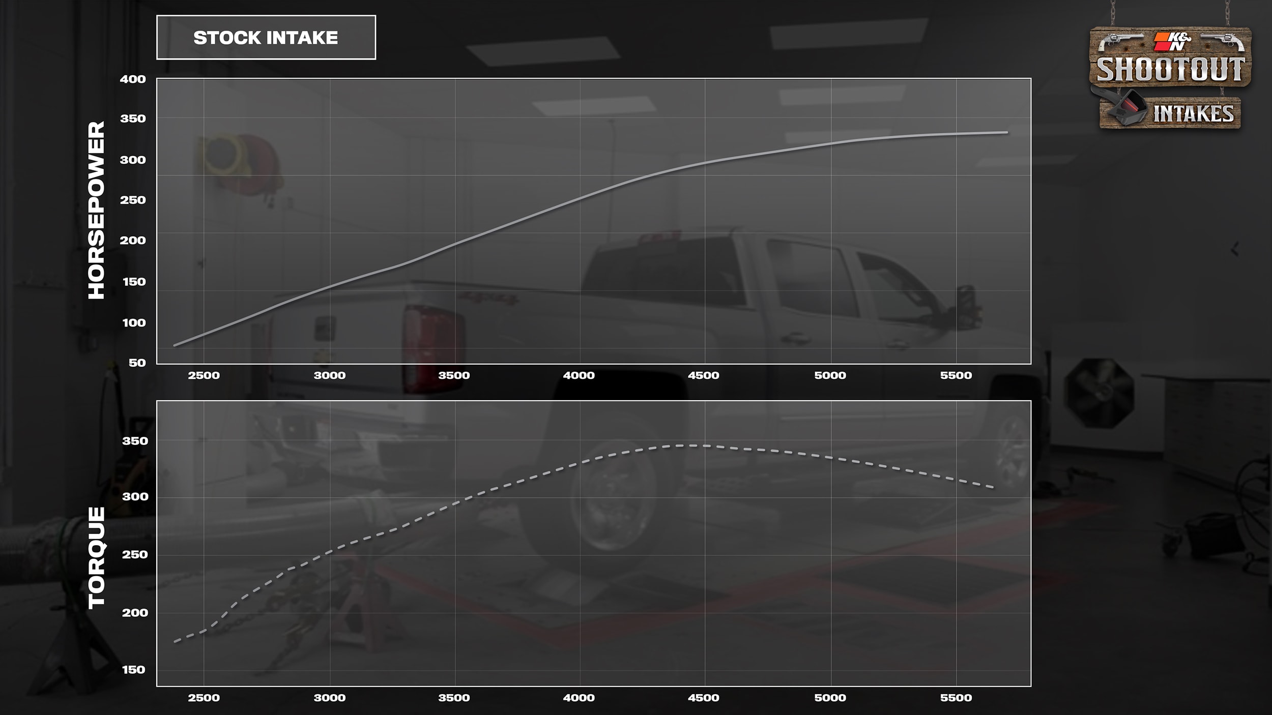 Test two…Dyno time! Once the stock intake is put back on the truck, our test Silverado is strapped down and brought up to operating temps. The first critical step is to get a solid baseline horsepower and torque curve to compare against. After three dyno runs, the graphs are analyzed and the top and bottom runs were removed, leaving the most average result to compare against, shown here:
