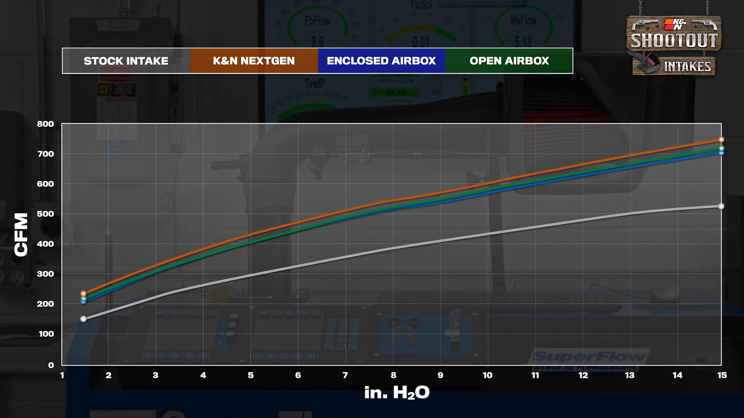 With any true test, there must be a winner. When comparing the numbers, the K&N NextGen intake showed the highest CFM numbers at the 1.5” and 15” levels. Since this is only a first comparison, the next step is heading over to the dyno for some power numbers.